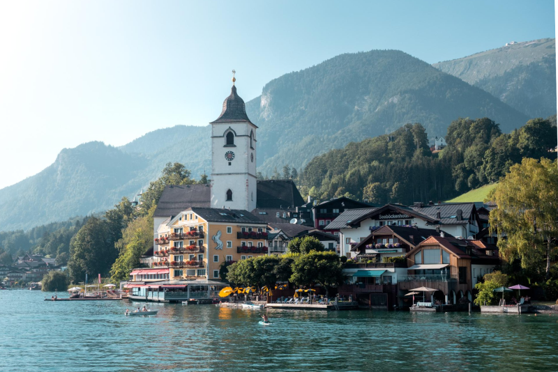Fotostopps über dem Wolfgangsee, anschließend ein entspannter Rundgang durch St. Gilgen mit Mozartplatz und Seeufer.St. Wolfgang – Promenade & Pilgerkirche